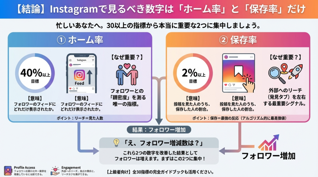 忙しいあなたのために、最初に結論からお伝えします。インサイトには30以上の指標がありますが、アカウントを伸ばすために本当に重要なのは以下の2つだけです。