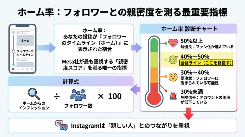 ホーム率とは、あなたの投稿が「フォロワーのタイムライン(ホーム)」にどれだけ表示されたかの割合です。これは、Meta社が最も重視する「親密度スコア」を測るための唯一の指標と言えます。