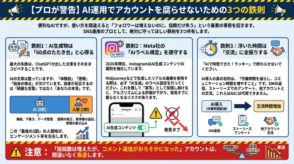 便利なAIですが、使い方を間違えると「フォロワーは増えないのに、信頼だけ失う」という最悪の事態を招きます。SNS運用のプロとして、絶対に守ってほしい鉄則を3つ共有します。