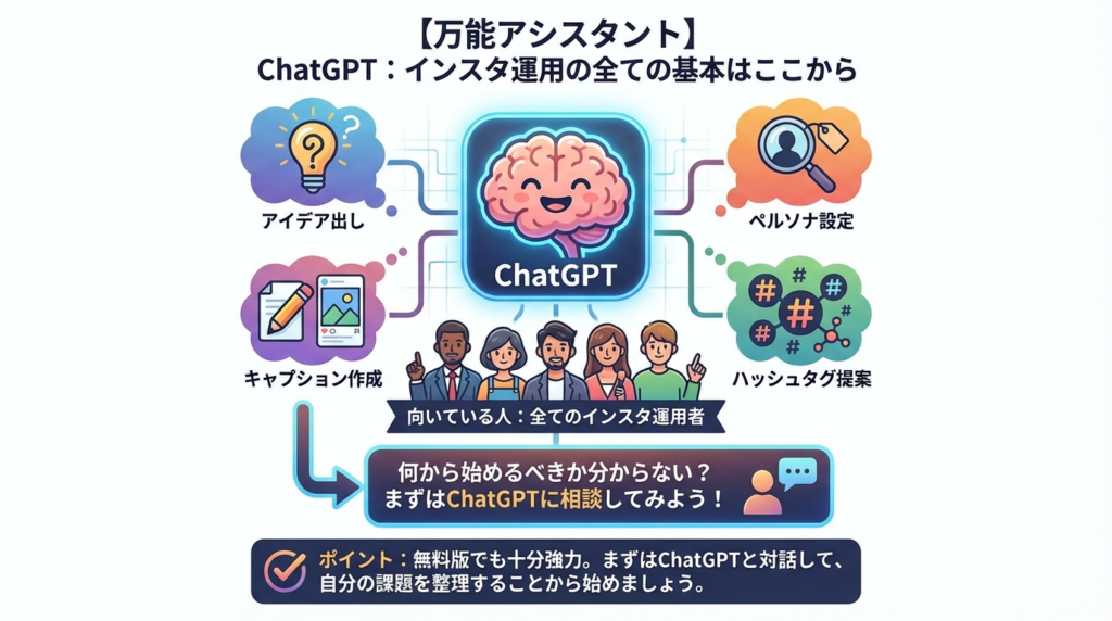 | 投稿ネタ・文章作成 | ChatGPT | ✅ あり | アイデア出しからキャプション作成まで、あらゆる壁打ちに対応。まずはここから。 |