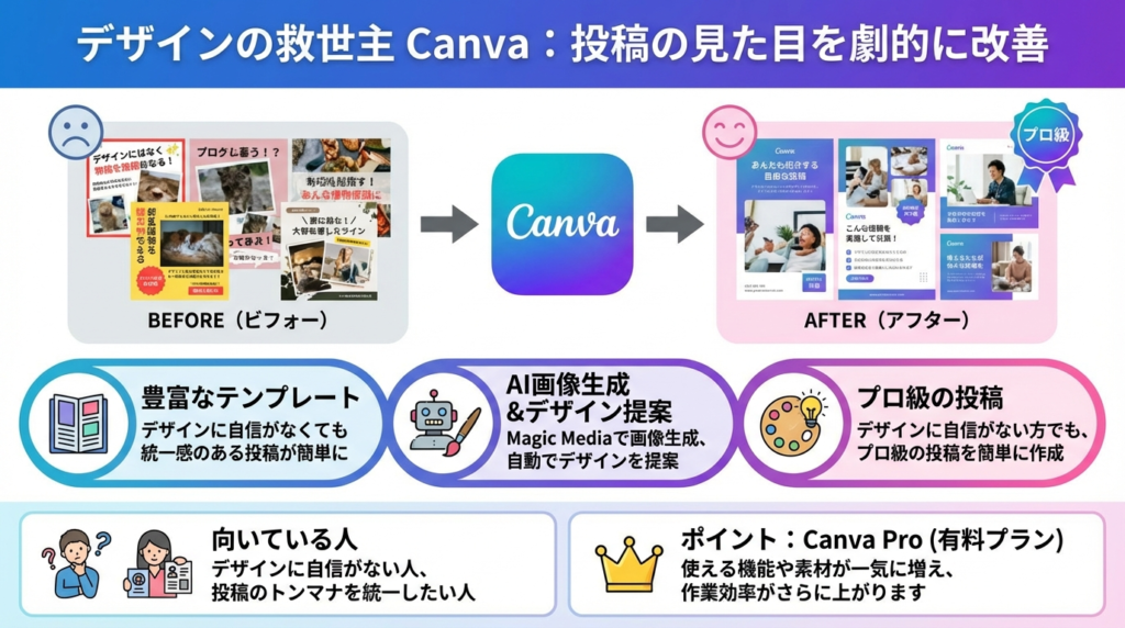 | 目を引く画像作成 | Canva | ✅ あり | 豊富なテンプレートとAI機能で、デザインが苦手でもプロ級の投稿が作れる。 |