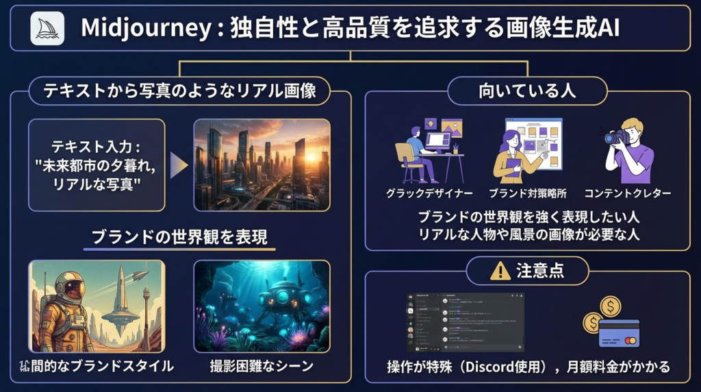 | 高品質なオリジナル画像 | Midjourney | ❌ なし | 写真のようなリアルな画像や、独自の世界観を表現したい上級者向け。 |
