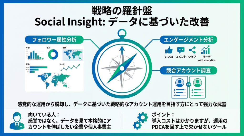| 競合・データ分析 | Social Insight | ❌ なし | アカウントの現状をデータで可視化し、戦略的な運用を実現したい方向け。 |
