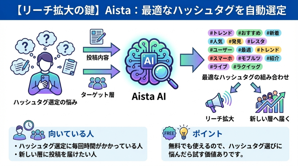 | ハッシュタグ選定 | Aista | ✅ あり | 投稿内容に最適なハッシュタグをAIが自動で提案。リーチ拡大に。 |