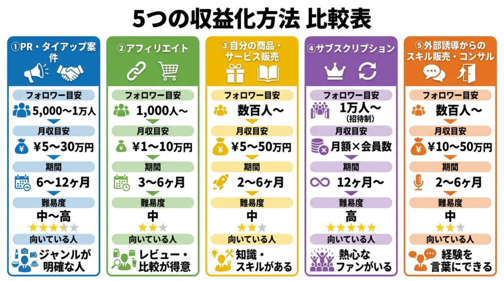 フォロワー数によって取れる方法が違います。まず比較表で全体像を確認してください。