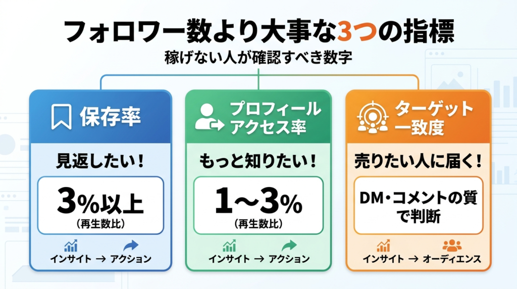 いいねは「面白い」という反応。保存とプロフィール訪問は「この人から買いたい」の前段階です。
