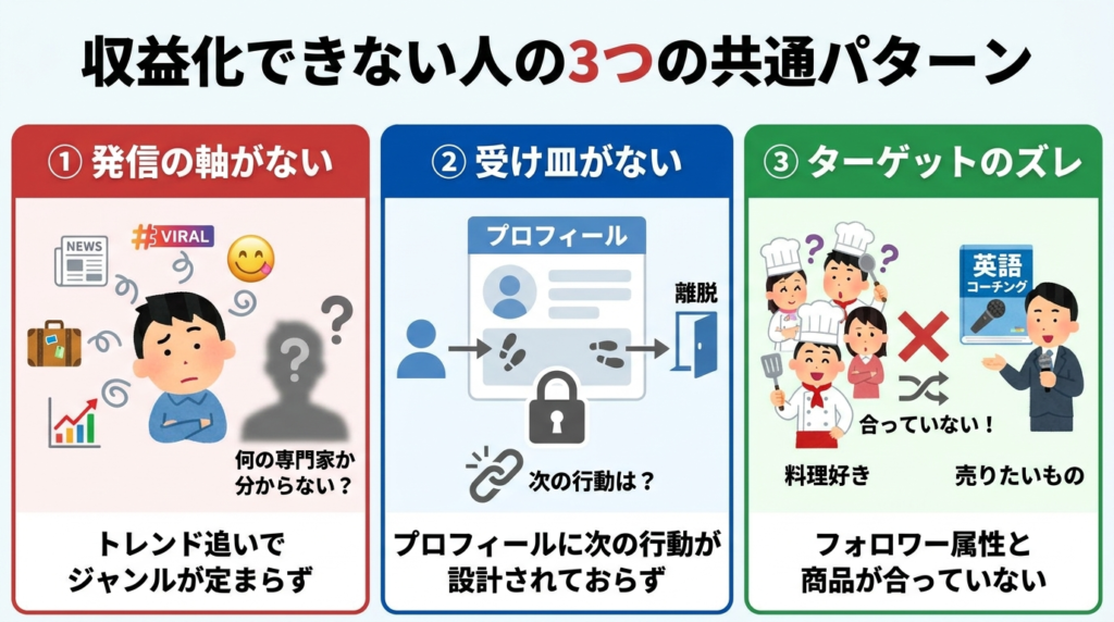 | ②受け皿がない | プロフィールや固定投稿に「次の行動」が設計されておらず、来てくれた人が離脱する |