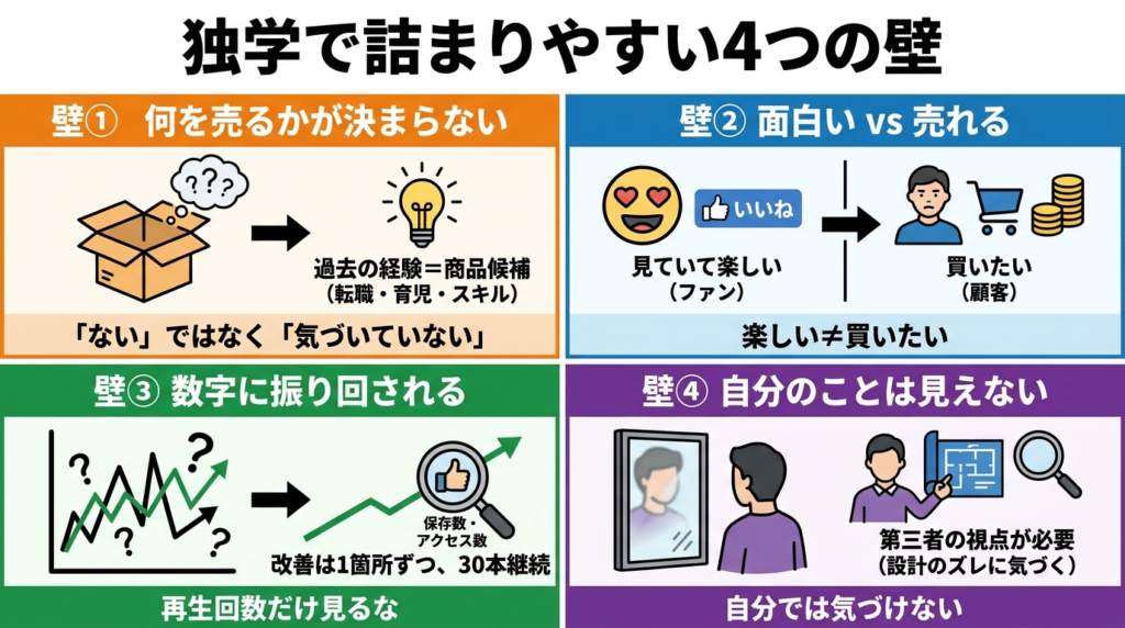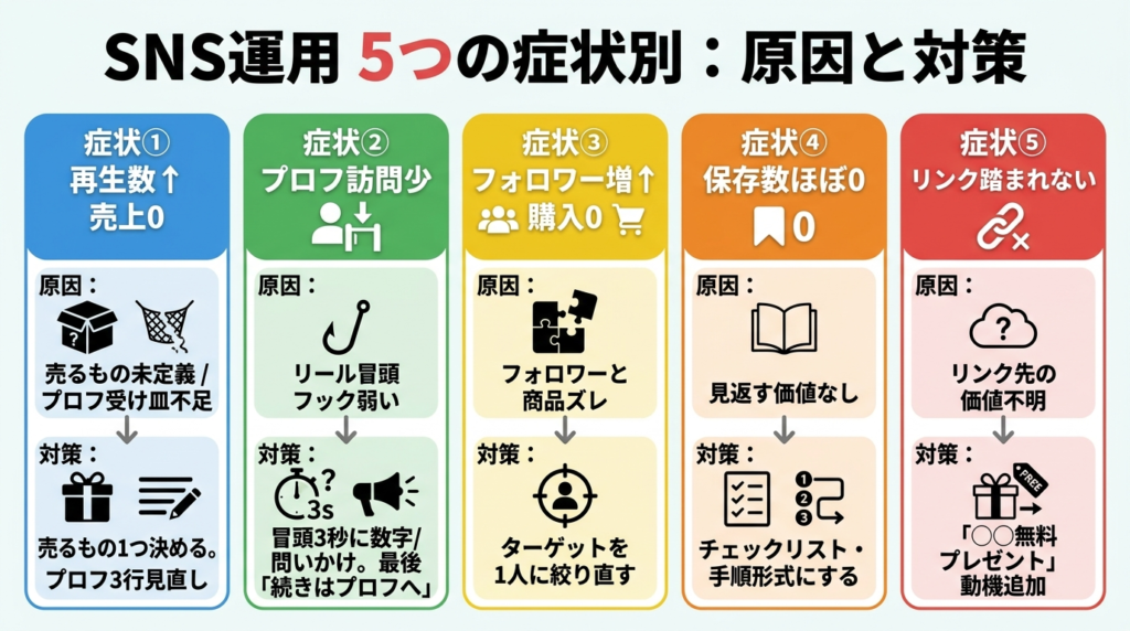 | ①再生数は伸びているのに売上ゼロ | 売るものが未定義 / プロフィールが受け皿になっていない | 売るもの1つを決める。プロフィール3行を書き直す |