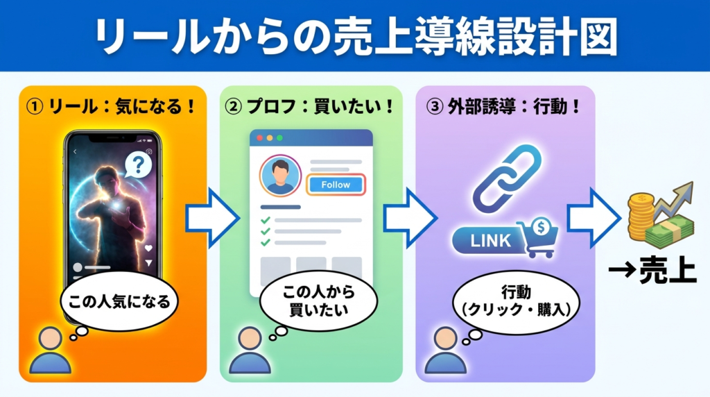 - リール→プロフィール→外部誘導の3段階がつながっていなければ、どれだけ良い動画でも収益にはならない