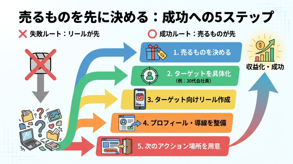 「リールを伸ばしてから売るものを考える」は失敗します。フォロワーの属性が固まった後では軌道修正がほぼ不可能だからです。