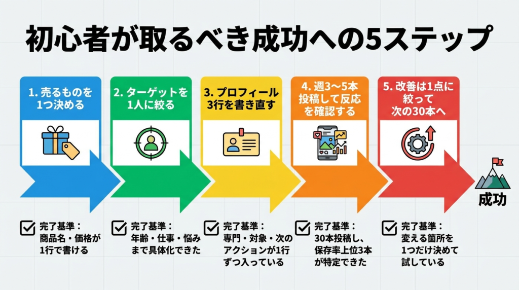 | 4 | 週3〜5本投稿して反応を確認する | 30本投稿し、保存率上位3本が特定できた |
