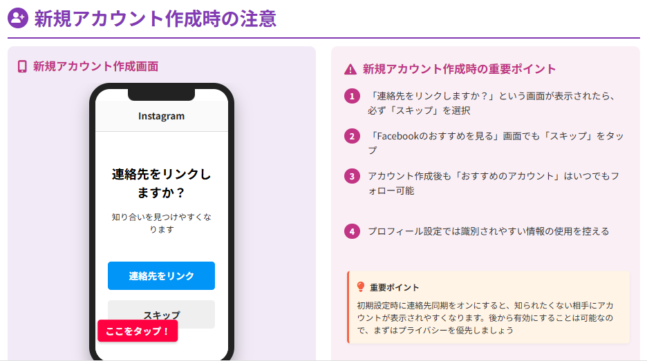 なぜなら、連絡先同期をオンにすると、あなたが意図しない相手にもアカウントが表示されるリスクが高まるから!