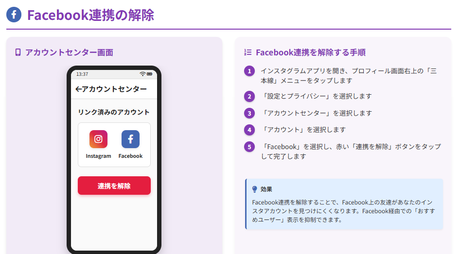 設定画面から「アカウントセンター」→「アカウント」と進み、Facebookとの連携を解除できます。これにより、Facebook経由でのアカウント発見リスクを減らせます。