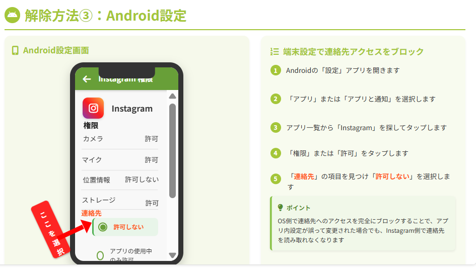 重要:スマホ本体の設定も確認することです。なぜなら、インスタアプリに連絡先へのアクセス権限を与えたままだと、誤って再度同期してしまう可能性があるからです。