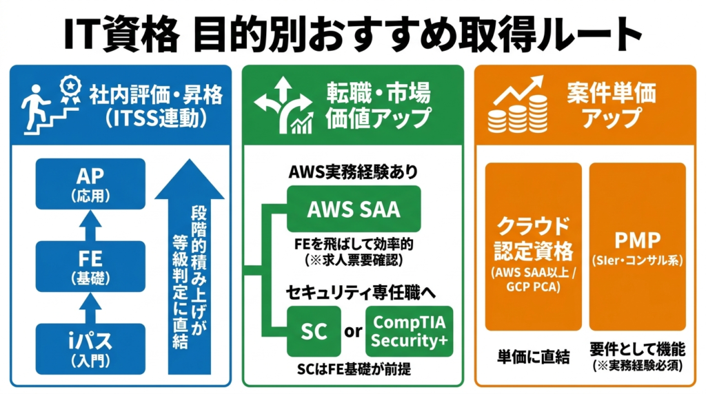 社内評価なら iパス・FE・APの順。転職・案件目的なら領域特化資格(AWS・CCNA等)への直行も有効です。上の「目的別ロードマップ」を参照してください。