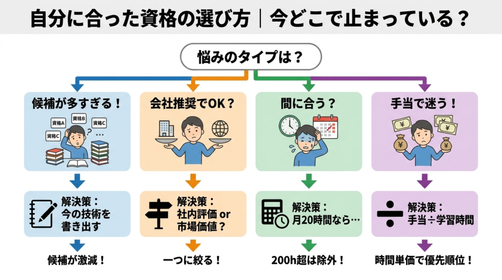 調べるたびに候補が増え、「おすすめ」を読んでも絞れない。それはあなたのせいではなく、資格は一覧から選ぶものではないからです。目的・役割・制約の3つが揃って初めて、次に取る1つが決まります。