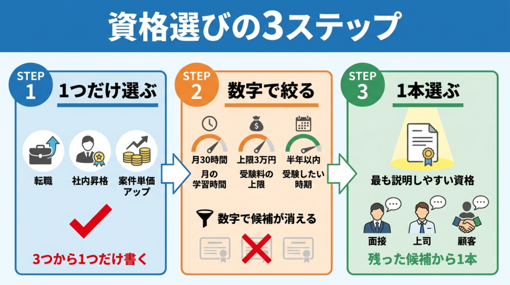 残った候補から「面接・上司・顧客に最も説明しやすい資格」を1本選ぶ