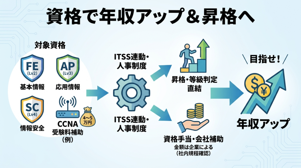 人事制度がITSSに連動している企業では、FE(Lv2)・AP(Lv3)・SC(Lv4)が昇格・等級判定に直結します。資格手当の金額は企業によって大きく異なるため、社内規程を直接確認するのが確実です。会社補助がある場合、CCNAのような受験料4〜5万円の資格も費用負担を減らせます