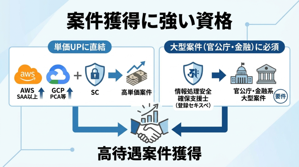 フリーランス・SES案件の単価に直結しやすいのは、AWS SAA以上・GCP PCA等のクラウド認定とSCの組み合わせです。官公庁・金融系の大型案件では、情報処理安全確保支援士(登録セキスペ)の登録が要件になるケースがあります。