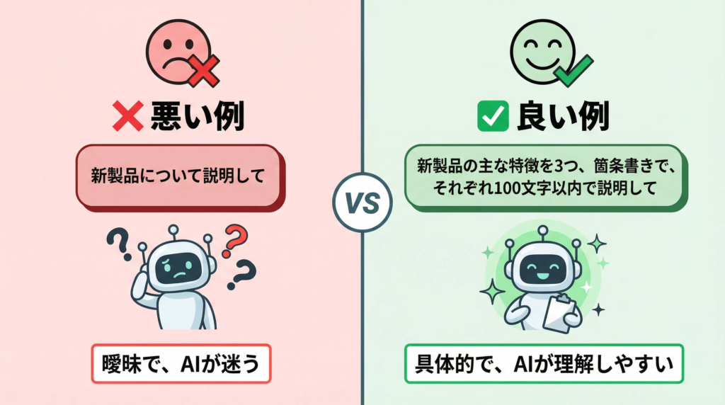 「もっと良くして」「もっと分かりやすく」のような曖昧な指示では、AIは何を改善すれば良いか理解できません。