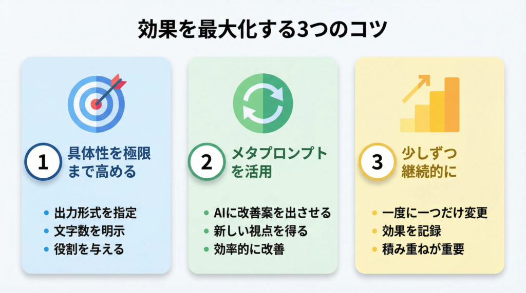 一度の完璧なプロンプトを目指すのではなく、小さな改善を積み重ねることが成功の鍵です。