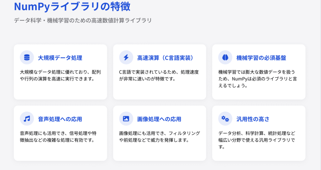 ここからは、初心者でも扱いやすく、実際のAI開発でよく使われている代表的なPythonライブラリを紹介します。