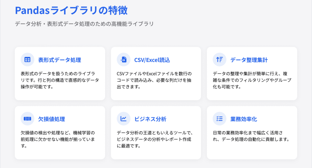 Pandasは、表形式のデータを扱うためのライブラリです。