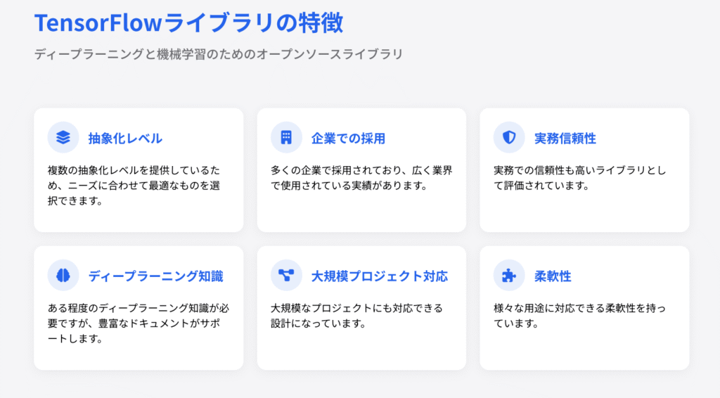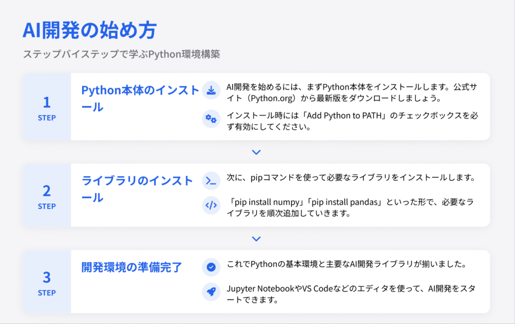 これらのライブラリを活用することで、複雑なAIの仕組みもPythonを通じて比較的シンプルに扱えるようになります。