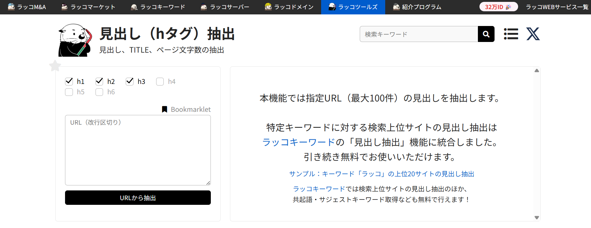 そのため、Googleとユーザーの両方から評価されている構成や情報の傾向を把握できる点で参考になります。また、見出し抽出ツールのラッコキーワードを使うと、競合ページで使われているタイトルや見出し(h1〜h3)を簡単に確認できます。