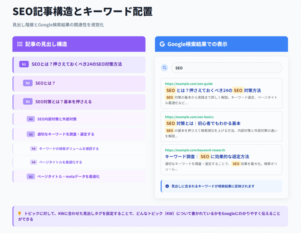 タイトルやh1にはメインキーワードを、h2やh3には関連キーワードを配置し、