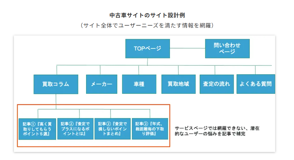 ユーザーが検索する背景には、「サービスの詳細を知りたい」といった顕在的なニーズだけでなく、「比較したい」「自分に合う方法を知りたい」といった潜在的なニーズもあります。こうした幅広いニーズに対応するために、サービスページ(固定ページ)で伝えきれない情報をお役立ち記事として提供することが重要です。