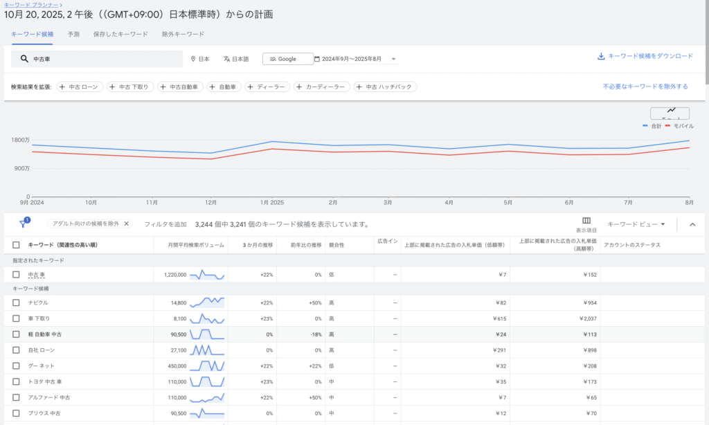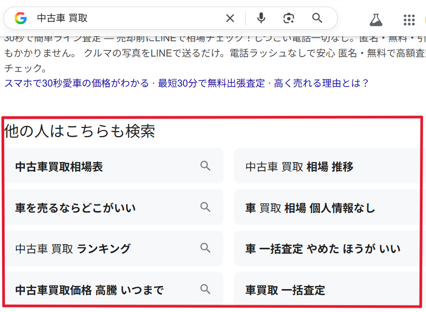 まず、Googleの関連キーワードからユーザーが何を求めているかを分析します。たとえば「中古車 買取」と検索すると、検索結果の下部に表示される関連キーワードから、ユーザーは「買取価格」「相場」「店舗」「地域」などの情報を知りたいとわかります。
