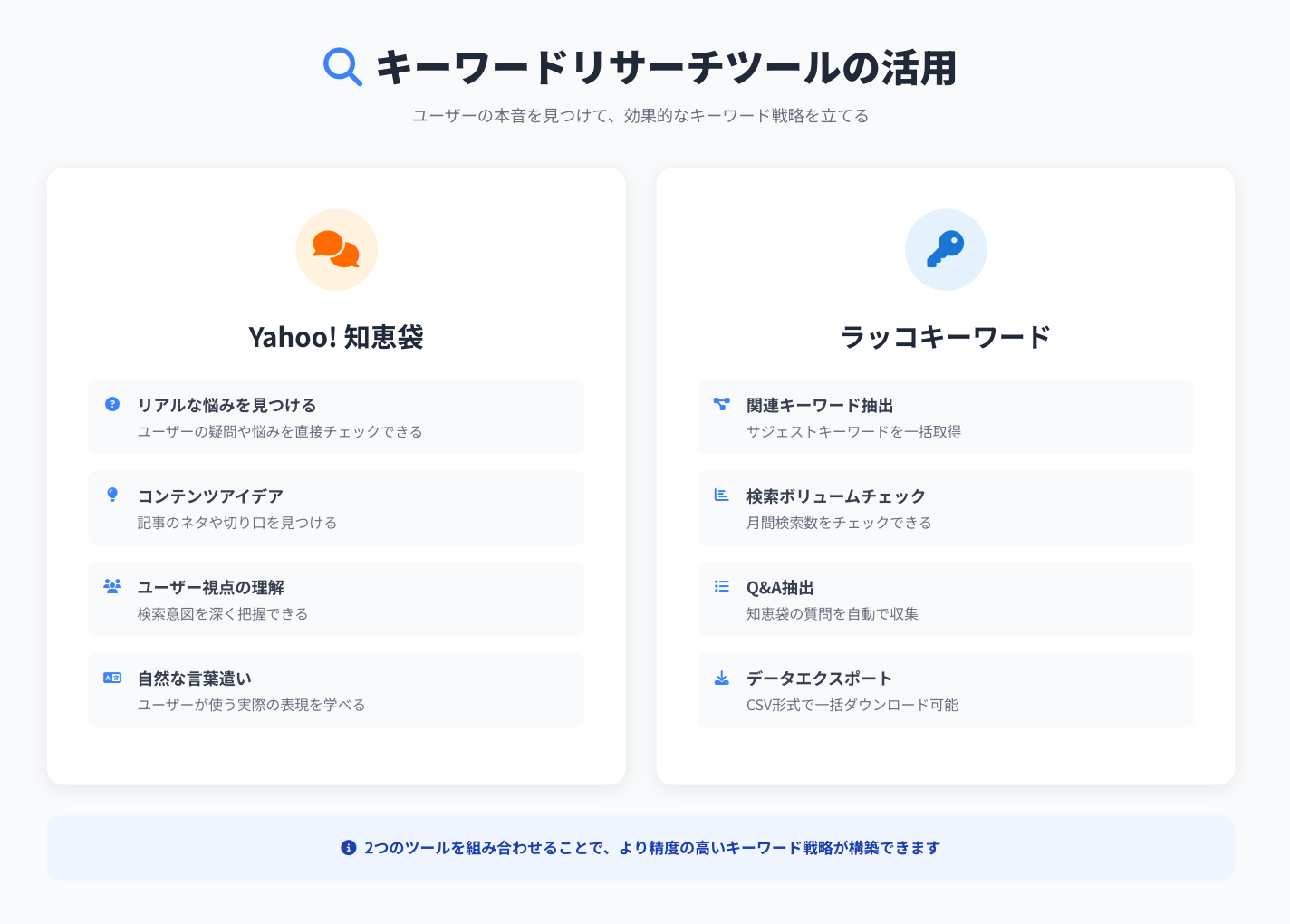 例:「SEO記事を長く読まれるようにするには」「上位を維持するリライト方法」など。潜在ニーズを満たすには、関連テーマへの内部リンクを設置したり、検索結果にない一次情報(体験・データ)を補足することが効果的です。