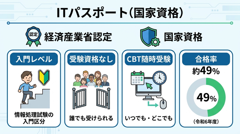 IT業界だけでなく、一般企業の事務・総務・営業でも「デジタル対応力の証明」として評価されます。受験資格なし・CBT随時受験・令和6年度合格率約49%(IPA公表値)。転職活動と並行しながら現実的に動ける国家資格です。