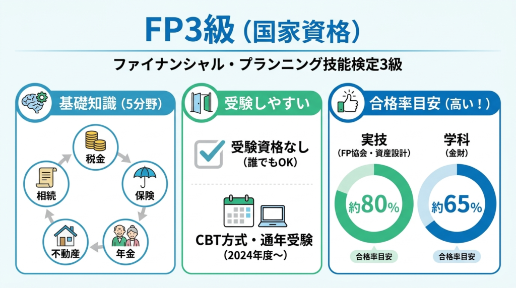 受験資格なし(3級)。FP協会・金財の公式サイトで過去問が公開されており、テキスト1冊+過去問集で完結可能。2024年度よりCBT通年受験が可能。FP協会実施の実技(資産設計提案業務)は合格率目安80%前後、金財実施の学科は目安65%前後(各実施機関公表値)。