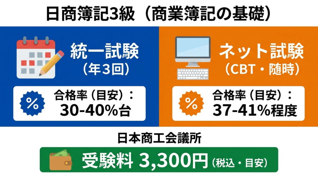 受験資格なし。テキスト・問題集・無料YouTube解説が充実。CBT随時受験(統一試験前後の休止期間あり)。統一試験の合格率は目安30〜40%台、ネット試験は目安37〜41%程度(商工会議所公表値)。受験料3,300円(税込・目安)。