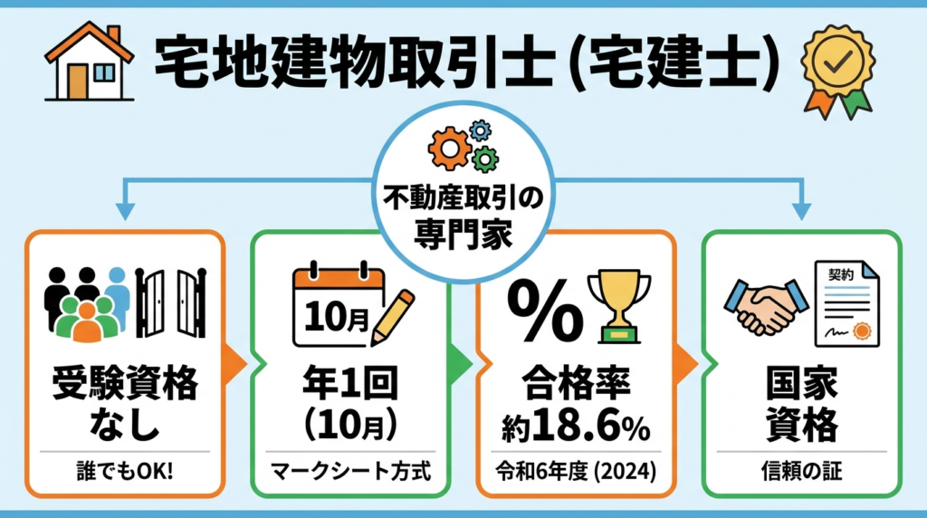 受験資格なし(学歴・実務経験不問)。テキスト(法令上の制限・宅建業法・権利関係)+過去問集+模試1回が基本の対策セット。過去問の類似問題が本番でも出やすい試験として知られています。学習時間の目安は300〜400時間(個人差あり)。年1回(10月)実施、4択マークシート。令和6年度合格率は18.6%(一般財団法人不動産適正取引推進機構公表値)。
