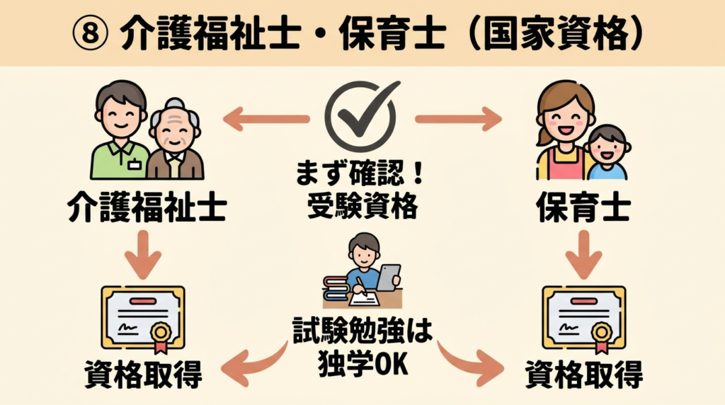| 介護・保育系に転職したい | 介護福祉士 / 保育士(※受験資格の確認が先) |