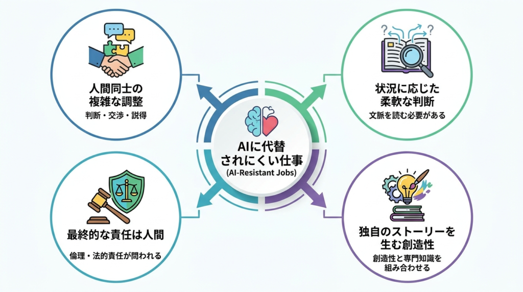 何かあったとき「AIが決めました」では通りません。最終的な責任は人間が負う仕事がAI耐性の高い仕事の特徴です。
