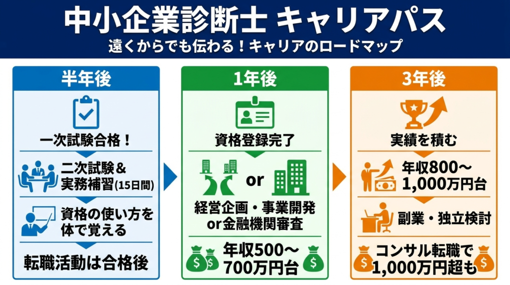 一次試験合格。次は二次試験と実務補習(実際の中小企業をコンサルする15日間の研修)が待っています。この期間に「資格の使い方」を体で覚える。転職活動は二次試験合格後に本格化するのが現実的です。
