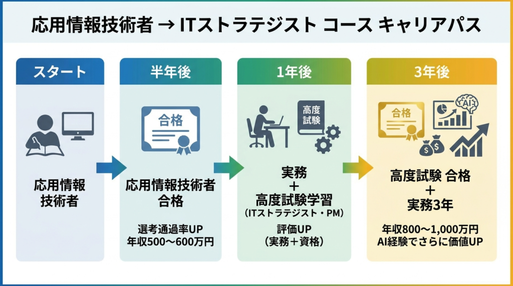 高度試験合格+実務3年の組み合わせで、年収800〜1,000万円台への移行が現実的になります。AI関連プロジェクトへの参画経験があれば、さらに市場価値が上昇します。