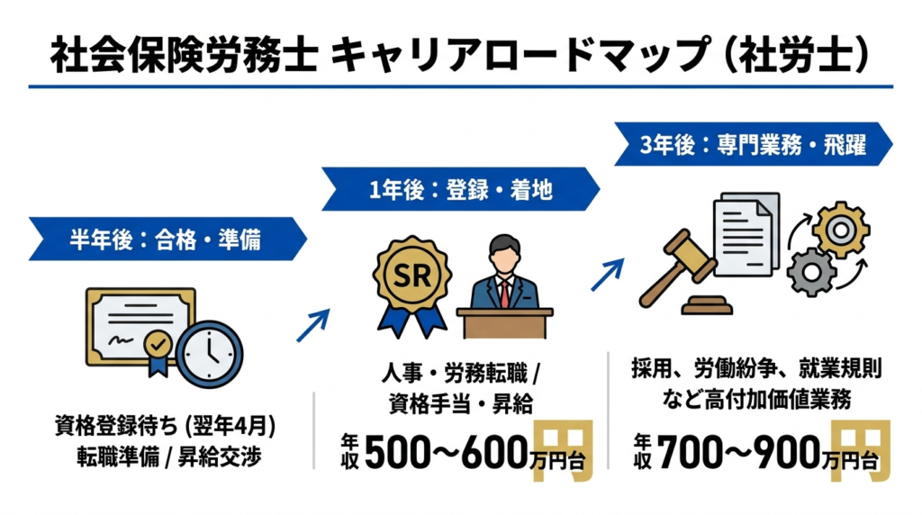 登録完了後、人事部・労務部門への転職、または現職での資格手当・昇給。年収500〜600万円台での着地が多い。