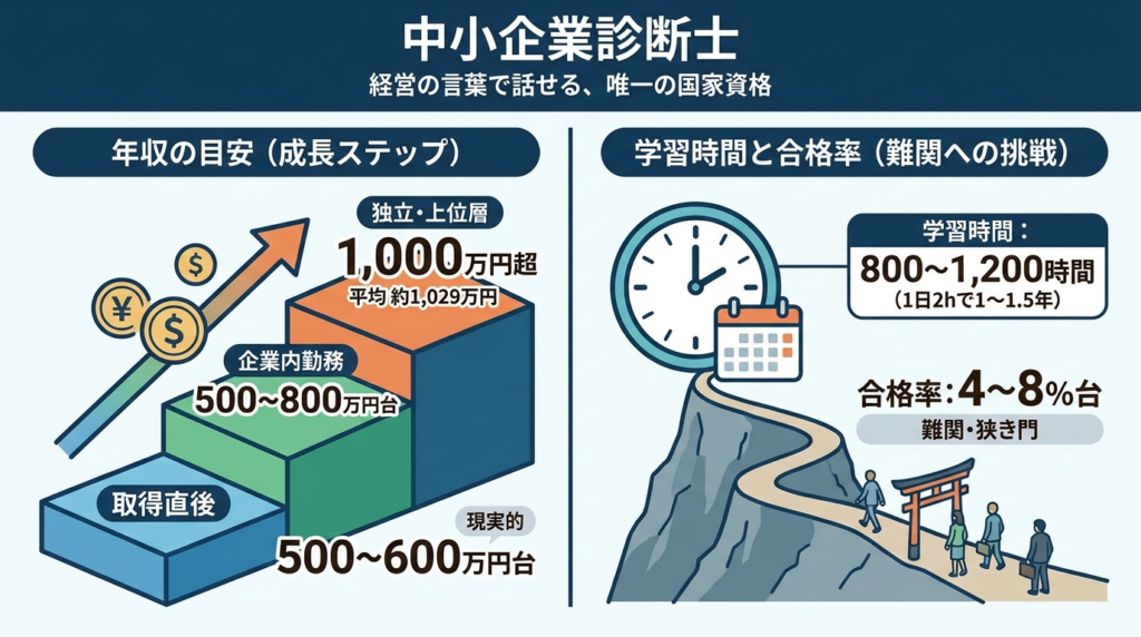 | 中小企業診断士 | ★★★ | ★★★ | 800〜1,200時間 | 14,500円 | 500〜1,000万円台 | △(実務補習あり) |