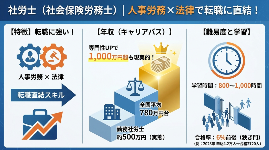 | 社労士(人事労務特化) | ★★★ | ★★★ | 800〜1,000時間 | 15,000円 | 500〜780万円台 | △(実務経験で上昇) |