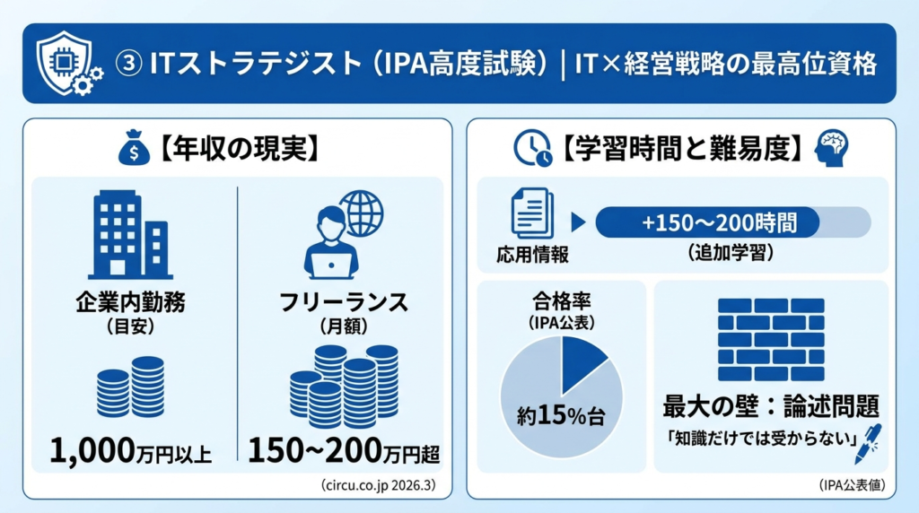 | ITストラテジスト | ★★★ | ★★★ | 150〜200時間※ | 7,500円 | 800〜1,000万円超 | ✕(実務前提) |