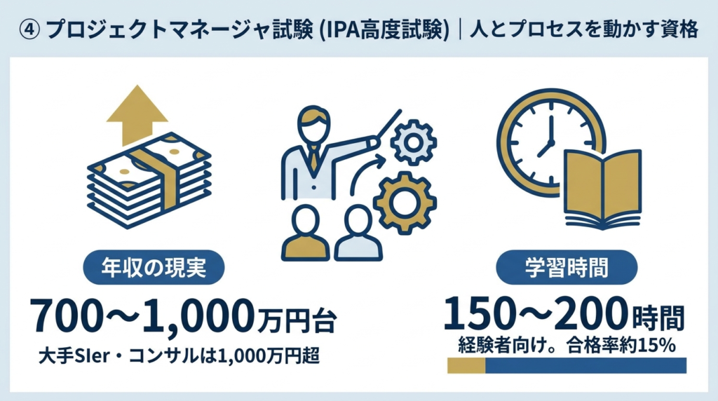 | プロジェクトマネージャ試験 | ★★★ | ★★★ | 150〜200時間※ | 7,500円 | 700〜1,000万円台 | △(経験推奨) |