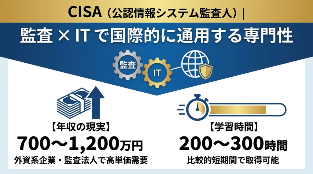 | CISA(公認情報システム監査人) | ★★★ | ★★ | 200〜300時間 | 約75,000円 | 700〜1,200万円 | △(実務要件あり) |