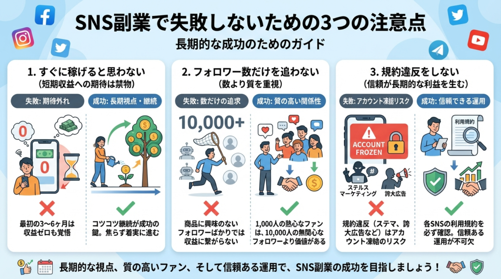 多くの人がSNS副業に挑戦しますが、途中で挫折してしまうケースも少なくありません。そうならないために、3つの注意点を押さえておきましょう。