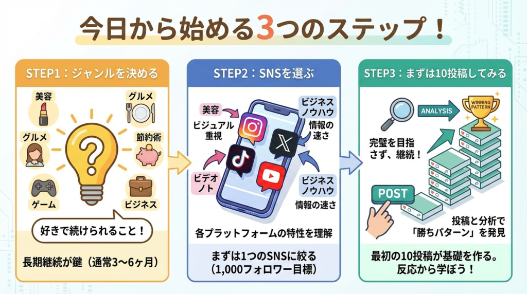各プラットフォームの特性を理解することで、より効果的な発信ができるようになります。一つのSNSに絞って、まずは1,000フォロワーを目指すことをおすすめします。