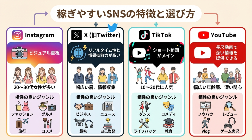 どのSNSを選ぶかは、副業の成功を大きく左右します。それぞれのプラットフォームの特徴を理解し、自分の発信内容に合った場所を選びましょう。